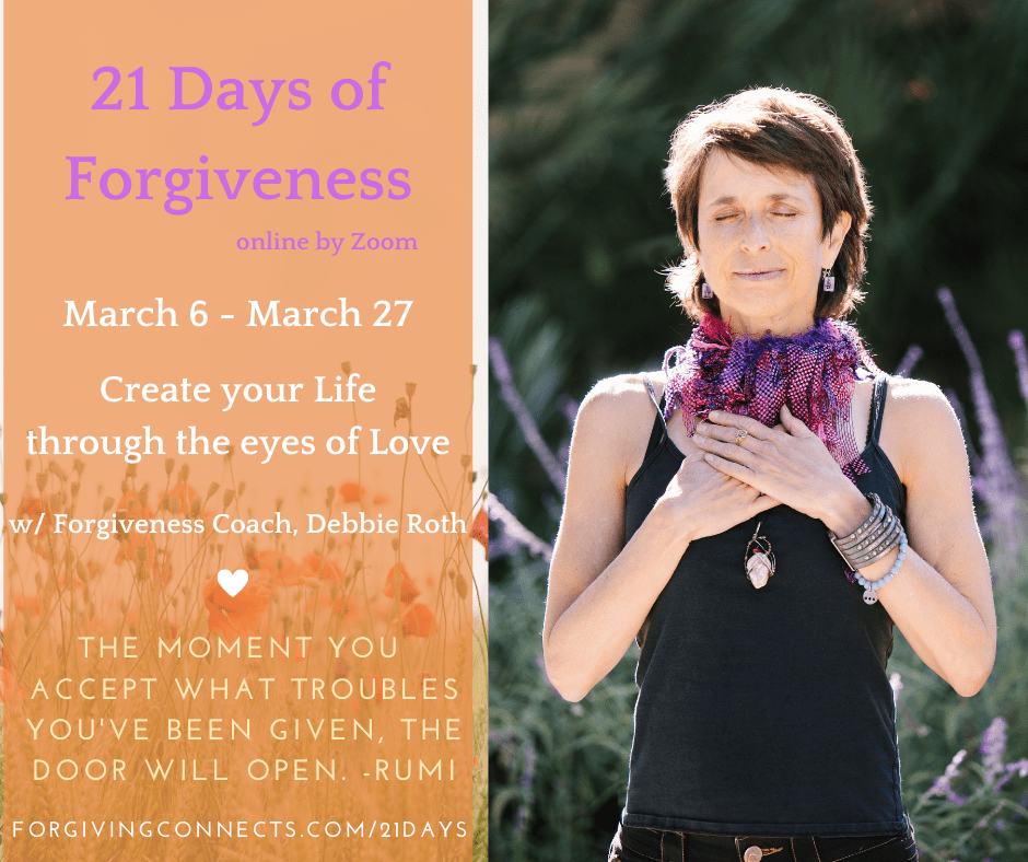 My name is Debbie Roth, and I’m a Professional Forgiveness Coach. I work with clients individually and in small groups to make peace with themselves and create more of what they truly want in their lives. (See my About page for more detail.)